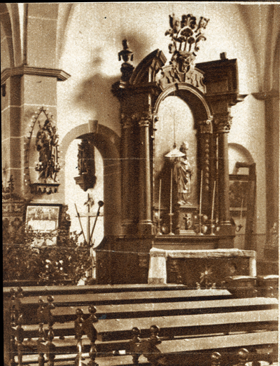 Volgens een notitie van Mathieu Spronck (va Sjiel va Nandsje) uit 1988 is het hoofdaltaar van de oude kerk overgeplaatst in de huidige nieuwe kerk, maar de beide zij-altaren niet. Een van deze zij-altaren zou teruggegeven of verkocht zijn aan de abdij van Val-Dieu (waar de drie altaren ook vandaan kwamen), maar onze speurtocht in Val-Dieu heeft vooralsnog niets opgeleverd: men weet daar van niets. Het andere zij-altaar werd in de nieuwe kerk geplaatst, links onder het oude oksaal (tegen de sacristie aan), maar op het moment van plaatsing (1958) was het bovenstuk met de schildering reeds verdwenen (verkocht door pastoor Frissen met medewerking van een amateur-antiek-handelaar). In 1962, begin januari, is dit altaar samen met de kerststal die ervoor stond totaal verbrand.