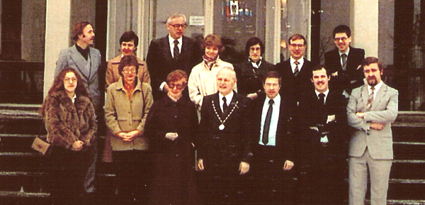 Laatste dag zelfstandige gemeente Cadier en Keer eind december1981. Personeel binnendienst. Vanaf links: Voorste rij onbekend (tijdelijke kracht), Annie Odekerken, Rita Schoenmakers, Sjef Van Laar, Sjef van Mulken, Jos Haesen, Anton Weijers. Achterste rij Leon Nijst, Mia Lemmens-Bisscheroux, Sjef Leenders, mevr. Maes, Annie Debie, Jacques Aussems, Ger Mertens