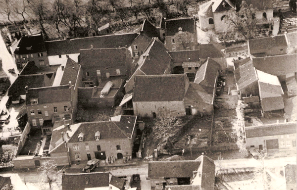 Tussen de Limburgerstraat (beneden) en de Kerkstraat. Vanaf links: achterzijde zusterklooster, voorzijde graanhandel Ackermans en dan de achterzijde van de carré boerderij Vliegen–Spronck.