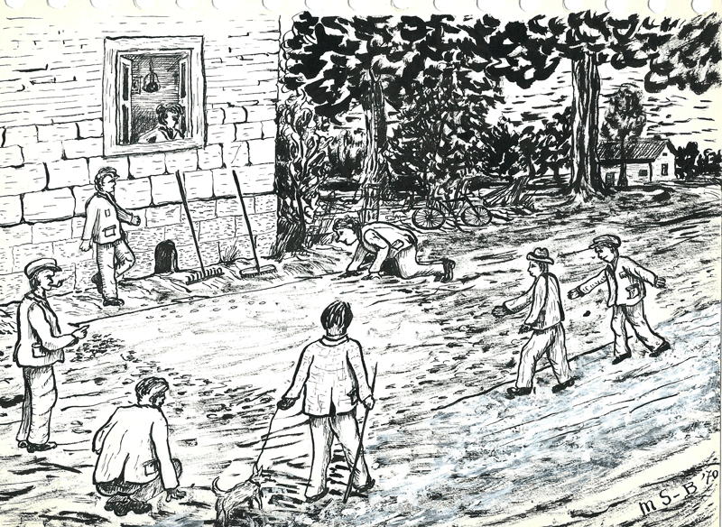 Laog eine mit ‘ne cènt batsj op d’r sjräöm, da prebeerde d’n aandere, alles of nieks, déi-j cènt va de sjräöm aaf te tietsje.