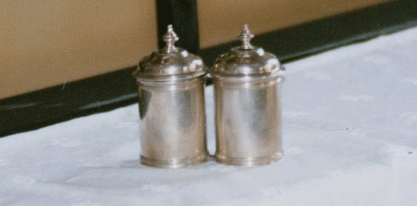 Twee gekoppelde, onversierde olie busjes van zilver uit het midden van de negentiende eeuw, met onder de voet het merk H D