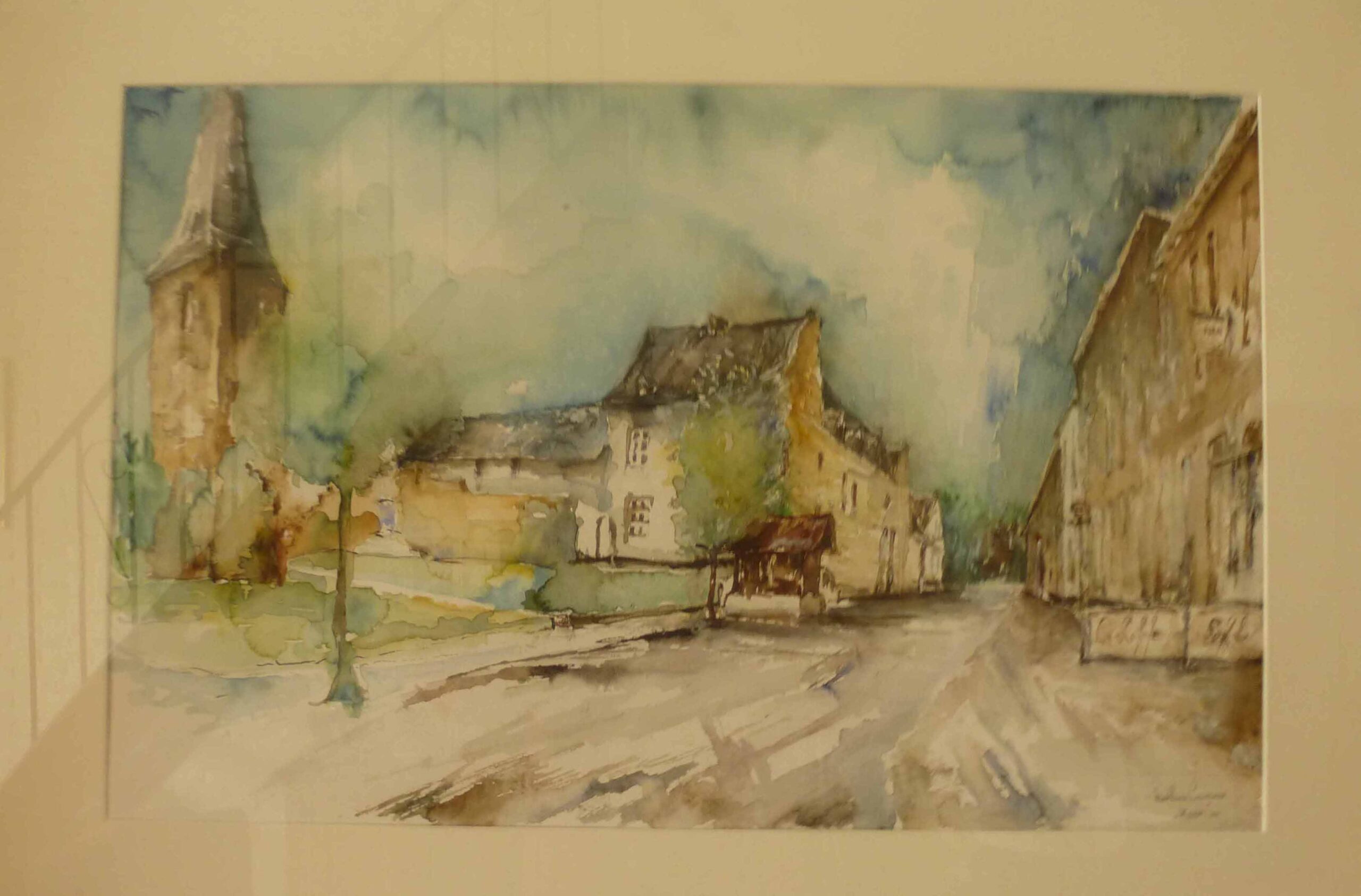 Aquarel van dit typisch Keerder dorpsgezicht met de oude kerktoren, de naastgelegen Meusenhof en de waterput.
